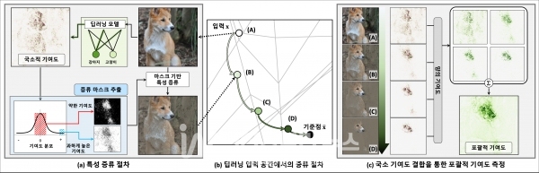 최교수 연구팀은 딥러닝 모델이 국소적인 입력 공간에서 보이는 입력 데이터와 예측 사이의 관계를 기반으로, 입력 데이터의 특징 중 모델 예측의 기여도가 높은 특징만을 점진적으로 추출해나가는 알고리즘과 그 과정에서의 입력과 예측 사이의 관계를 종합하는 방법을 고안해 모델의 예측 과정에 기여하는 입력 특징의 정확한 기여도를 계산했다.