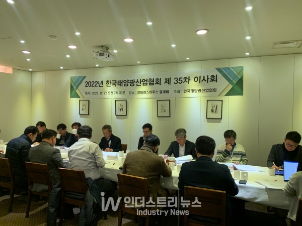 [인더스트리뉴스 정한교 기자] 한국태양광산업협회(이하 협회)는 지난 22일 오전 7시 반 달개비에서 이번 환경부의 불합리한 태양광 재활용공제조합 설립 인가 대응을 위해 제35차 이사회를 진행했다고 밝혔다.
