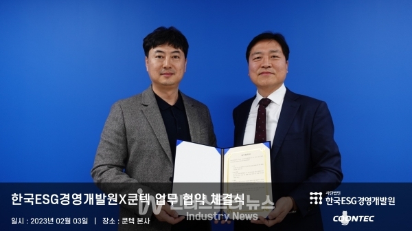 [인더스트리뉴스 정한교 기자] ESG 경영 관리 전문기업 쿤텍(대표 방혁준)이 ESG 통합 컨설팅을 제공하는 한국ESG경영개발원(대표원장 이한성)과 국내기업들이 맞춤형 ESG 경영 체계를 구축할 수 있도록 컨설팅 협력을 위한 양해각서(MOU)를 체결했다고 6일 밝혔다.