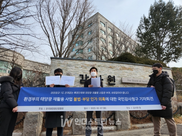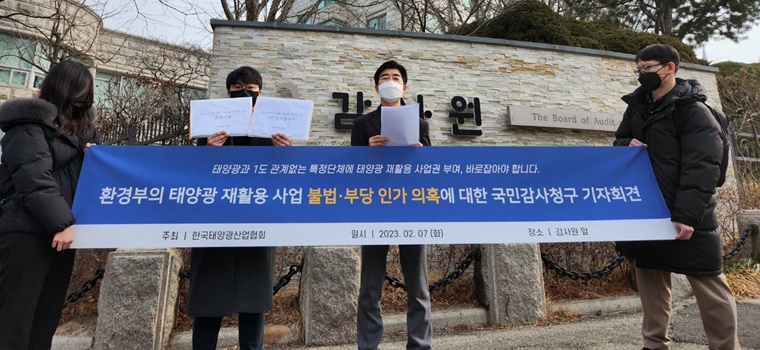 협회 관계자는 “태양광 생산자책임재활용 제도가 하루빨리 본연의 목적으로 돌아가 생산자 중심의 환경과 산업이 상생하는 제도가 되길 바란다”며, “국민감사청구를 통해 환경부의 재활용사업에 대한 불법・부당 인가 의혹이 명확하게 밝혀지길 강력하게 요청한다”고 말했다.