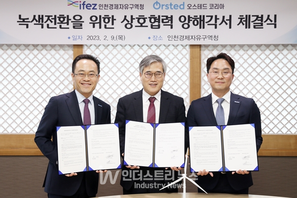 [인더스트리뉴스 이건오 기자] 인천경제자유구역청과 글로벌 해상풍력 선도기업 오스테드 (오스테드 코리아)는 인천경제구역의 녹색전환과 탄소중립, 이를 통한 인천 경제 및 산업 발전, 그리고 인천 해상풍력산업 활성화를 위한 상호 업무협약을 9일 체결했다.