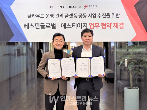 [인더스트리뉴스 조창현 기자] 클라우드 딜리버리 플랫폼기업 베스핀글로벌(대표 이한주)과 IT서비스관리(ITSM)솔루션 전문기업 에스티이지(STEG, 대표 임현길)가 클라우드 운영관리 플랫폼사업 공동 추진을 위한 업무협약을 체결했다고 14일 밝혔다.