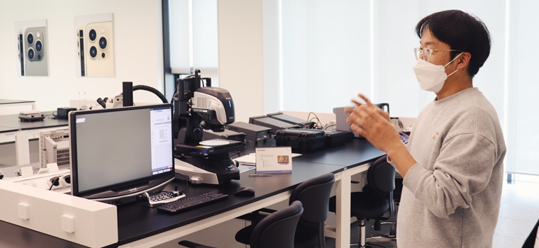 포항가속기연구소 내에 위치한 애플 제조업 R&D 지원센터 1층에는 반도체 공장에서 볼 수 있는 클린룸이 구축돼 있다. 카메라 모듈, 전자제품 조립 등 공정 개선에 활용할 수 있는 △전자동 초정밀 웨이퍼 다이(Die) △결합 장비 표면처리 플라즈마 클린 장비 △초정밀 고속 제트 납땜 장비 등이 마련돼 있다. 더불어 1층 엑스레이룸에는 비파괴 방식으로 소재를 분석할 수 장비가 구축돼 있다. 제품 소재 분석에 활용할 수 있는 첨단 장비가 마련된 2층에는 6500배까지 배율을 확대할 수 있는 △광학 현미경 장비, 소재를 잘라서 단면을 확인할 수 있는 △파괴분석 장비 등이 마련돼 있다.