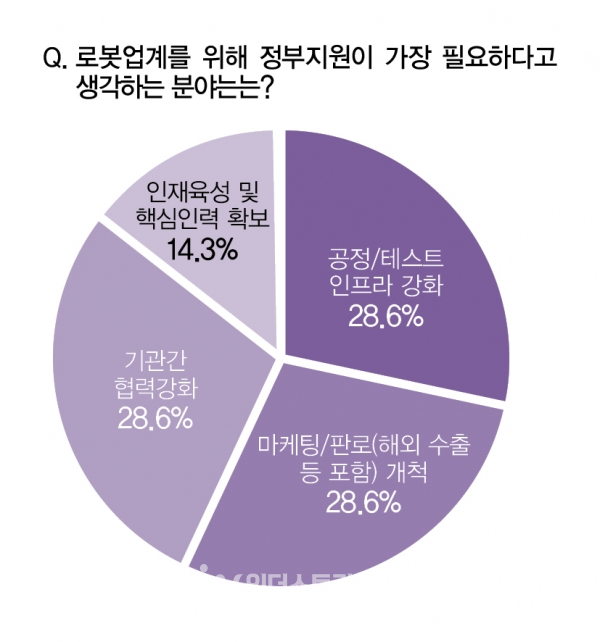 AMR 공급기업들은 가장 큰 애로사항으로 ‘판로개척의 어려움’(57.1%), ‘시장정보 부족’(14.3%), ‘인증획득의 어려움’(14.3%) 등을 꼽았다. 이에 정부지원이 해당 부분에 필요하다고 응답했다. 구체적으로 로봇업계를 위해 정부지원이 필요한 분야를 묻는 질문에 ‘마케팅/판로 개척’, ‘기관간 협력강화’, ‘공정/테스트 인프라 강화가 각각 28.6%의 선택을 받았다.