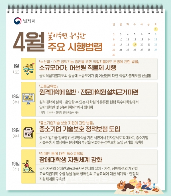 한편 법제처(처장 이완규)는 4월에 총 70개의 법령이 새로 시행된다고 밝혔다. 새로 시행되는 법령의 제정‧개정이유 및 주요 내용은 국가법령정보센터에서 확인할 수 있다.