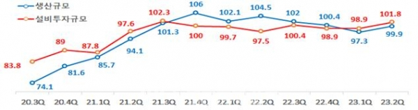 [인더스트리뉴스 최종윤 기자] 산업통상자원부(장관 이창양, 이하 산업부)의 2023년 2분기 ‘중견기업 경기전망조사’ 결과 설비투자규모 전망지수가 부정 전망 98.9에서 긍정 전망 101.8로 전환됐다. 지수가 100 이상이면 직전 분기보다 다음 분기를 긍정적으로 전망한다.