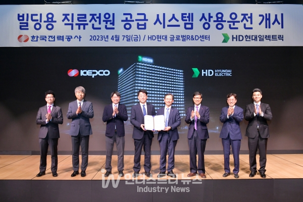 [인더스트리뉴스 조창현 기자] HD현대의 전력기기 및 에너지솔루션 계열사 HD현대일렉트릭이 세계 최초로 ‘1MW급 빌딩용 직류(DC)배전 설비’ 상용화에 성공했다. HD현대일렉트릭은 한국전력과 공동 개발한 1MW(메가와트)급 직류전원 공급시스템 상업 운전 개시 기념식을 경기도 판교에 위치한 HD현대 글로벌R&D센터(이하 GRC)에서 7일 진행했다.