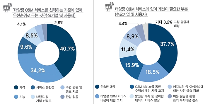 수요기업 및 사용자를 대상으로 한 설문에서 ‘태양광 O&M 서비스를 선택하는 기준에 있어 우선순위로 두는 것’에 대한 응답으로는 가격(40.7%)과 기능(34.2%)이 전체 답변의 3분의 2 이상을 차지하며 월등히 많았다. 이어 서비스 통합성(9.6%), 브랜드 및 기업 신뢰도(8.5%), 주변 평판 및 홍보 자료(4.1%) 순으로 답변이 이뤄졌다.
