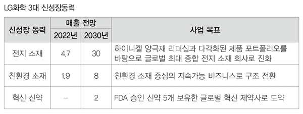 이로써 LG화학의 전지 소재를 포함한 친환경 소재, 혁신 신약 등 3대 신성장동력의 매출 비중은 2022년 21%(6.6조)에서 2030년 57%(40조)로 올라서게 된다. LG화학은 기존 석유화학 중심의 비즈니스에서 ‘톱 글로벌 과학 기업(Top Global Science Company)’으로 포트폴리오의 대전환점을 맞게 될 전망이다.