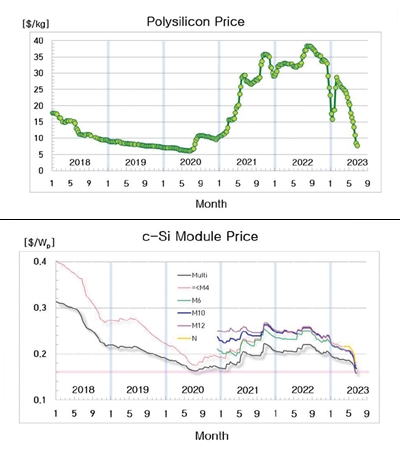 2022년 하반기부터 중국에서의 폴리실리콘 생산용량이 급증하면서 시장은 점차 수급이 안정됐으며, 2023년에는 글로벌 폴리실리콘 생산용량의 89% 정도를 보유하고 있는 중국에서 폴리실리콘이 공급과잉 상태에 들어서면서 연초부터 폴리실리콘 가격이 급락했다. 6월 21일 기준으로 폴리실리콘 평균가격이 7.72$/kg을 기록하면서 중국 폴리실리콘 주요 생산업체들의 제조단가 수준까지 하락했다. 즉, 2022년 하반기부터 시작된 폴리실리콘 고공행진에 마침표를 찍은 것이다.