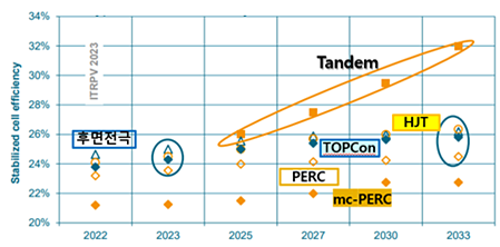 최근 1.5년 사이에 초기효율이 4%p 정도 향상되는 급상승을 보여주고 있어 탄소중립 실현을 위한 차세대 기술로서의 기대감을 높이고 있다. M6 웨이퍼 면적에서는 2023년 5월 독일의 옥스퍼드PV(Oxford PV)가 초기효율 26.8%를 달성했다. 중국 론지솔라는 2022년 12월 초기효율 29.6%(면적 1cm2)를 발표하며 효율 경쟁에 등장하더니, 2023년 5월 ‘SNEC 2023’ 전시회에서 초기효율 31.8%(면적 1cm2), 2023년 6월 ‘인터솔라 유럽 2023’ 전시회에서 초기효율 33.5%(면적 1cm2)를 발표하며 경쟁국들에게 충격을 안겨주고 있다. 2019년 알키미스트 프로젝트를 추진하면서 탠덤 태양전지 효율 목표 35%를 세계최초로 발표한 우리도 분발해야 할 것이다.
