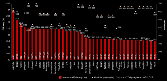 2023년 6월 기준 상용모듈 효율 순위를 살펴보면, 중국 아이코솔라(Aikosolar)의 ABC(All Back Contact) 후면전극 태양광 모듈이 24.0%로 상용 모듈 효율 순위 1위에 등극하면서 24% 모듈 시대를 열었다. 중국의 론지솔라(LONGi Solar)의 HPBC(Hydrogen Passivated Back Contact) 후면전극 태양광 모듈이 23.2%, 싱가포르에 본사를 둔 미·중 합작 맥슨솔라(Maxeon Solar)가 IBC 후면전극 태양광 모듈 기술이 22.8%를 기록하며 TOP3가 모두 후면전극 모듈이다.