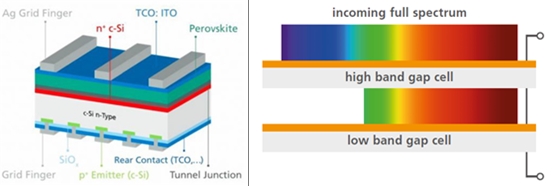세계는 지금 차세대 초고효율 탠덤 태양전지 기술개발에 무한경쟁 중이다. 페로브스카이트(Perovskite)-결정질 실리콘 탠덤 태양전지는 결정질 실리콘 태양전지 위에 페로브스카이트 박막 태양전지를 적층해 서로 다른 파장대의 빛을 흡수함으로써 동일면적 대비 태양전지 효율을 극대화할 수 있는 기술이다. 이론적 한계효율은 44%로 예측돼 실리콘 태양전지의 이론적 한계효율 29.4%를 극복할 수 있는 대안으로 주목받고 있다.