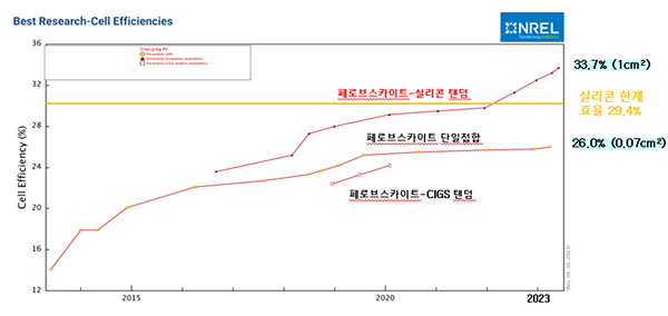 유무기 복합형이 일반적인 페로브스카이트 물질은 가시광 영역에서 높은 광흡수와 저온 공정이 가능해 고효율화에 유리하다. 2009년 일본에서 페로브스카이트를 태양전지에 최초로 적용했고, 최근 기술개발을 통해 효율이 급상승해 차세대 태양전지로 주목받게 됐다.