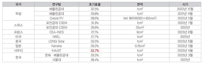 독일 등 유럽 중심으로 결정질 실리콘 태양전지 중심에서 결정질 실리콘 태양전지 위에 페로브스카이트박막을 직렬연결한 2단자(2T) 모놀리식 탠덤 태양전지로 전환을 모색하고 있다. 2022년 7월 스위스 로잔공대(EPFL) CSEM 연구소에서 초기효율 31.3%(면적 1cm2)를 달성하며 최초로 30%를 돌파했다. 독일 베를린공대(HZB)에서는 2022년 12월 초기효율 32.5%(면적 1cm2)를 기록했다. 사우디아라비아 KAUST에서 2023년 4월 33.2%(면적 1cm2), 2023년 5월 33.7%(면적 1cm2)라는 세계최고 초기효율을 달성하여 NREL 차트에 1위로 등극했다.