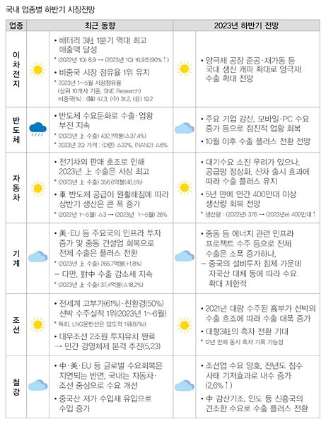 [인더스트리뉴스 이건오 기자] 물가 안정화와 더불어 우리나라 실물경제가 회복세에 접어들며 올해 하반기 이후 2024년에는 본격적인 경기회복이 있을 것으로 보인다. 특히, 이차전지, 자동차, 조선 등의 업종을 중심으로 하반기 전망이 밝아 기대를 모으고 있다.