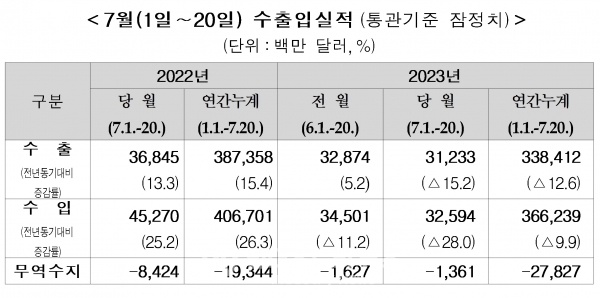 최근까지 집계된 7월 수출입 현황을 살펴보면 하반기 무역수지 개선을 위해 많은 노력이 필요할 것으로 분석된다. 관세청이 7월 1일부터 20일까지 집계한 수출입 현황에 따르면 △수출 312억 달러 △수입 326억 달러로 지난해 같은 기간보다 수출은 15.2%, 수입은 28.9% 감소했다.