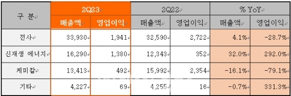 한화솔루션이 27일 공개한 ‘2023년 2분기 전사 및 부문별 실적’에 따르면 매출은 지난해 같은 기간 보다 4.1% 늘어난 반면 영업이익은 28.7% 감소했다.
