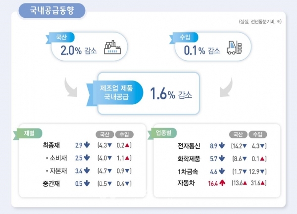 최종재 및 중간재에 대한 국내 공급도 축소됐다. 최종재는 자동차 등 수입이 0.2% 늘었으나, 기계장비 등 국산이 4.3% 줄어 2.9% 감소했다. 중간재는 전자·통신 관련 국산 제품이 0.5%, 1차금속 등에 대한 수입 제품이 0.4%씩 감소하며 0.5% 줄어들게 됐다.