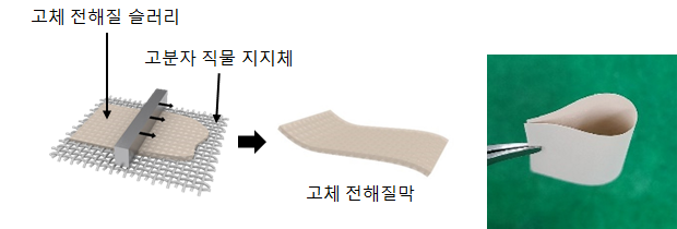이와 같은 한계를 극복하기 위해 ETRI 연구진은 우수한 이온전도도를 갖는 황화물계 고체 전해질과 기계적 강도가 우수한 고분자 직물 지지체를 활용해 얇은 고체 전해질막을 개발하는 데에 성공했다. 또한, 대면적화가 용이한 습식공정 기술을 개발, 우수한 성능과 동기에 기계적 강도, 유연성까지 확보했다.