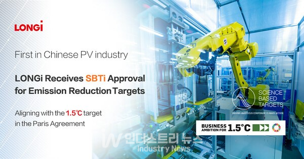 [인더스트리뉴스 조창현 기자] 중국 태양광 패널 기업 최초로 SBTi 감축 목표를 공식 인증받은 기업이 탄생했다. 세계 일류 태양광 기술기업 론지(LONGi)는 ‘과학 기반 감축목표 이니셔티브(Science Based Targets initiative, SBTi)’로부터 배출 감축 목표 승인을 받았다고 지난 28일(현지시각) 발표했다.