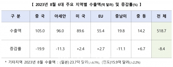 한편 중국과 아세안 지역에 대한 수출은 감소했다. 주요 수출품인 반도체 가격하락 등으로 인한 중간재 수입 감소가 원인인 것으로 분석된다. 다만 아세안 수출 중 51%를 차지하는 베트남에 대한 수출은 디스플레이 및 일반기계 수출이 회복되면서 플러스 전환하게 됐다.