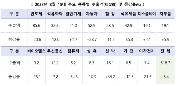 우리나라 최대 수출품목인 반도체는 올해 8월 수출이 20.6% 줄어들게 됐는데, 메모리반도체 수요가 일부 회복되고 업계에서 진행 중인 추가 감산 등으로 수급 상황은 개선되고 있으나 IT기기 판매 약세 및 파운드리 가동률 하락 등으로 수출이 감소하게 된 것으로 파악된다. 다만 산업부는 반도체 수출이 지난달보다는 15% 증가한 86억 달러를 기록했으며, 1분기 저점 이후 개선 흐름을 이어가고 있다고 설명했다.