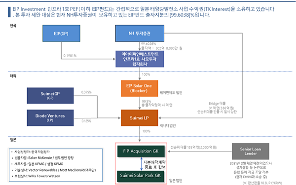 NH투자증권은 2021년 3월경 일본 태양광발전소 Suimei Solar Park가 준공되면, EIP 1호와 Suimei LP를 통해 소시에테제네랄, SBI신세이, 아오조라은행 등으로부터 자금을 조달받은 후, DMM닷컴이 소유한 잔여 지분 64%를 인수해 에쿼티브릿지론 31억7,220만엔(한화 약 336억원)을 회수하는 한편, 태양광발전소에서 생산한 전력을 판매해 연 8%대의 수익률을 올리겠다는 계획을 갖고 있었다.