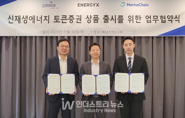 [인더스트리뉴스 이건오 기자] 에너지엑스가 지난 11월 2일, 갤럭시아머니트리, 마리나체인과 함께 신재생에너지 기술 기반 토큰증권 상품 및 신재생에너지 STO 출시를 위한 업무협약을 체결했다고 밝혔다.