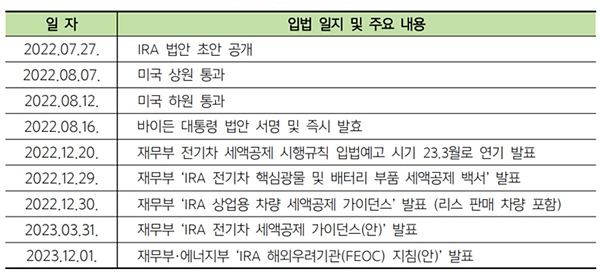미국의 인플레이션감축법(이하 IRA)은 ‘해외우려기관(FEOC, Foreign Entity of Concern)’의 배터리 부품과 핵심 광물 사용을 각각 2024년과 2025년부터 금지하고 있으나 FEOC의 기준과 세부 내용이 마련되지 않아 관련 기업의 혼란을 발생시켜 왔다.
