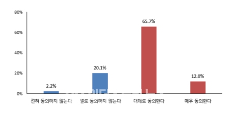 또 ‘기후위기 대응을 위한 녹색전환 투자가 경기도에 새로운 기회를 가져다 줄 것으로 보느냐’는 질문엔 77.7%가 동의했다. RE100 규제가 도내 기업의 경쟁력과 지역경제에 부정적 영향을 미친다는 것에는 65%가 “그렇다”고 봤다.