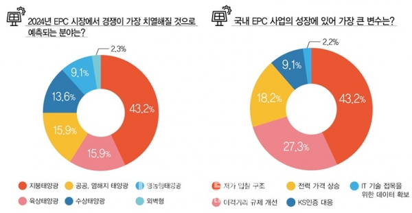 2024년 EPC 시장에서 경쟁이 가장 치열할 것으로 예측된 분야는 ‘지붕태양광(43.2%)’이었다. 그 다음은 ‘육상태양광(15.9%)’, ‘염해지태양광(15.9%)’으로 집계됐다.