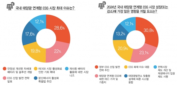 현시점 기준 국내 태양광 연계 ESS 시장의 가장 큰 이슈는 ‘안정성 개선’인 것으로 조사됐다. 응답자들은 ‘안전성이 개선된 차세대 배터리 등 솔루션 개발’을 가장 많이(28.6%) 꼽았다. 그 뒤를 ‘ESS 산업 발전 전략 발표(22%)’, ‘RE100 시장 활성화로 인한 기회 확대(19.8%)’, ‘분특법 추진(17.6%)’, ‘재사용 배터리 활용에 대한 시장 니즈(12.1%)’ 등이 이었다.