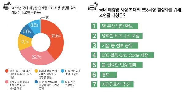 이들은 △배터리 열 분산 방안 확보 △명확한 비즈니스 모델 △VPP 및 전력 거래 활성화 △일관된 정책 추진 △기술 등 정보 공유 △홍보 △자연친화적인 추진 등을 제안했다.