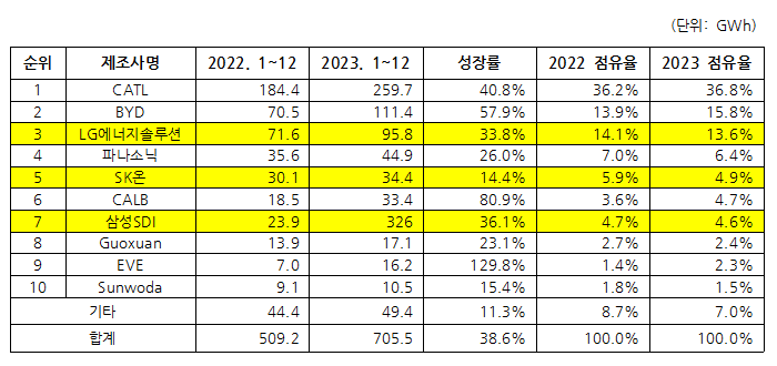 K-배터리 3사도 톱10 자리를 지키며 선전하는 한 해를 보냈다. LG에너지솔루션이 2022년 71.6GWh에서 올해 95.8GWh로 33.8% 성장해 시장점유율 13.6%로 3위를 기록했으며, SK온과 삼성SDI가 각각 4.9%, 4.6%의 시장점유율로 5위, 7위 자리를 지켰다.