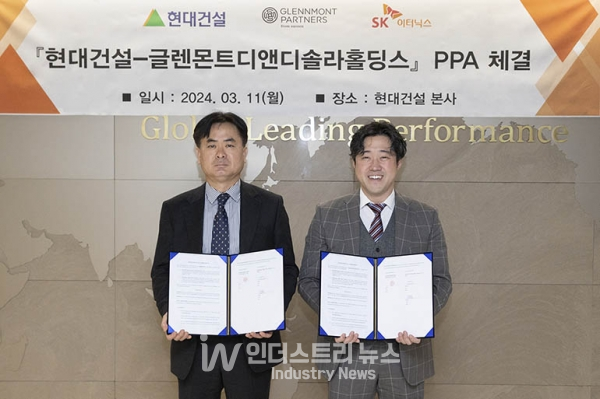 [인더스트리뉴스 최용구 기자] 현대건설(대표 윤영준)은 글렌몬트디앤디솔라홀딩스(Glennmont D&D Solar Holdings)와 태양광 전력구매계약(PPA)을 체결했다고 12일 밝혔다.