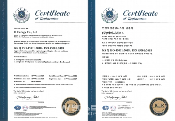 에이치에너지 관계자는 “‘ISO 45001’ 인증은 그동안 사회적 책임을 강조하고, 지속 가능한 사업 운영을 위해 펼쳤던 당사의 노력이 인정받은 것”이라며, “향후 사업장에서 발생할 수 있는 여러 위험 요소를 사전에 대비하고, 관련 법적 요구사항을 파악해 안전보건경영시스템 관리체계를 수립할 예정”이라고 말했다.