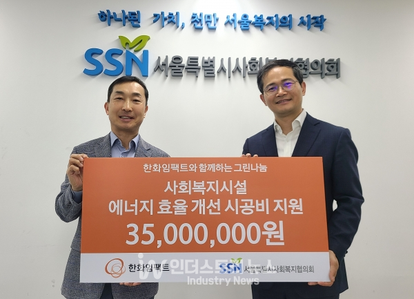 한화임팩트는 지난 18일 서울 마포구에 위치한 서울특별시사회복지협의회에서 ‘사회복지시설 에너지 효율 개선 시공비 지원’ 기부금 전달식을 가졌다고 19일 밝혔다.