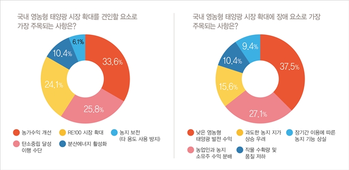 또 따른 응답자는 “토지 이용 제한구역인 농업진흥구역 내 설치 가능 등의 규제 개선이 필요하다”며, “농업생산량과 전력생산량을 최적화하는 연구개발이 필요하고 교육과 홍보를 통한 인식개선으로 주민 수용성을 확보하는 것이 필요하다”고 전했다.