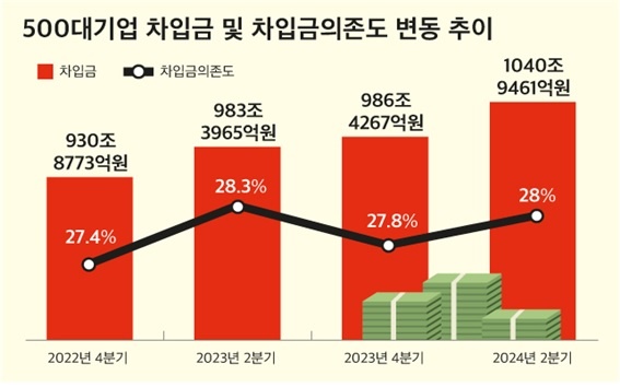 500대 기업의 2분기 총차입금 규모는 1040조9461억원으로, 2022년 4분기에 비해 110조688억원 늘었다.