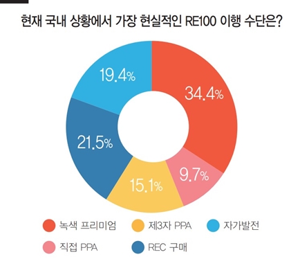 <현재 국내 상황을 고려해 가장 현실적인 RE100 이행 수단은?>이라는 질문에 34.4%의 응답자가 ‘녹색프리미엄’을 선택했다. 뒤를 이어 21.5%가 ‘REC 구매’를, 19.4%는 ‘자가발전’, 15.1%는 ‘제3자 PPA’, 9.7%가 ‘직접 PPA’를 선택했다.