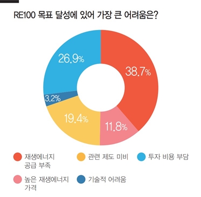 <RE100 달성에 있어 가장 큰 어려움은?>이라는 질문에 업계 관계자 중 38.7%가 ‘재생에너지 공급 부족’을 선택했다. 전세계 재생에너지발전 비중의 평균을 크게 밑도는 우리나라 발전 비중으로는 RE100을 이행할 수 없다는 의견이다.