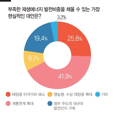 <재생에너지발전 비중을 채울 수 있는 가장 현실적인 대안은?>이라는 질문에 41.9%의 업계 관계자가 ‘계통연계 확대’를 선택했다. 뒤를 이어 25.8%가 ‘태양광 이격거리 해소’, 19.4%가 ‘정부 주도의 대규모 발전단지 구축’을 선택했다. 이와 함께 영농형·건물일체형(BIPV)·수상 태양광 등의 확대, 실현가능한 신기술 개발 등이 필요하다고 언급했다.