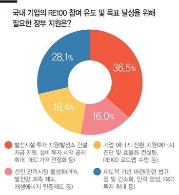 <국내 기업의 RE100 참여 유도 및 목표 달성을 위해 필요한 정부 지원은?>이라는 질문에는 36.5%가 발전소 건설 자금 지원, 설비 투자 세액 공제 확대, REC 가격 안정화 등 ‘발전시설 투자 지원’을 선택했으며, 28.1%는 ‘제도적 기반 마련’을 선택했다.