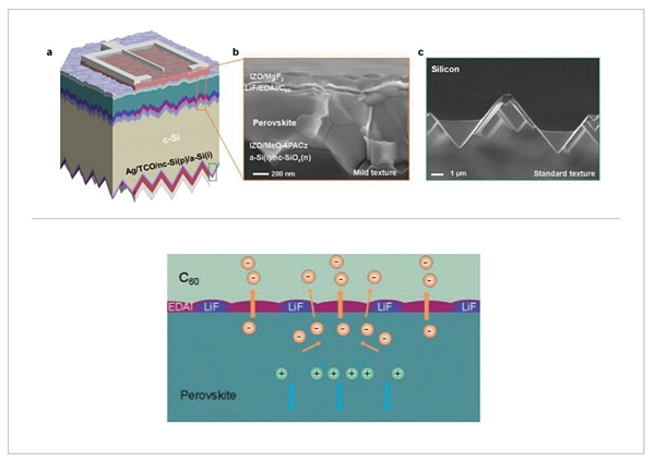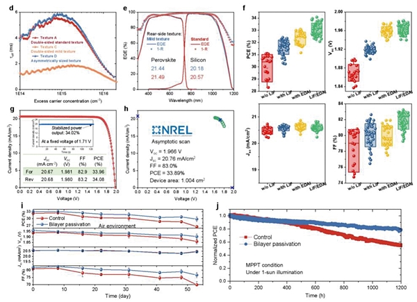 상부셀 페로브스카이트/전자수송층(ETL) 계면에서의 재결합 감소를 위해 이중층(Bilayer)을 적용해 패시베이션 효과를 개선했다는 내용이 핵심이다. 분산된 LIF 초박막 위에 이요오드화이암모늄(EDAI)을 증착한 이중층을 적용했다. 습식 용액 공정으로 균일한 두께의 페로브스카이트 상부셀 박막 형성을 위해서 HJT 하부셀의 표면요철을 완화해 초기효율 33.9%(면적 1cm2)를 NREL에서 검증받았다. 봉지 없이 상온 질소 분위기에서 실시된 1-Sun(AM 1.5G, 100cm2/W) 광조사시험에서 1,200시간 후에도 초기효율의 80% 이상을 유지했다.