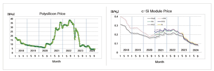 중국 기업들이 가동률을 낮추며 감산해 2024년 폴리실리콘 생산량 추정치를 220만MT에서 196만MT로 하향했다. 이 생산량만으로도 900GW의 모듈을 생산할 수 있기 때문에 대부분의 태양광 제조업체가 올해 손실을 보고할 것으로 예상되며 일부는 파산이나 매각될 것으로 경고했다. 역사적인 최저치를 기록하고 있는 모듈 가격은 n형 TOPCon 제품 기준으로 연말까지 0.10달러/Wp 미만을 유지할 것으로 전망된다.