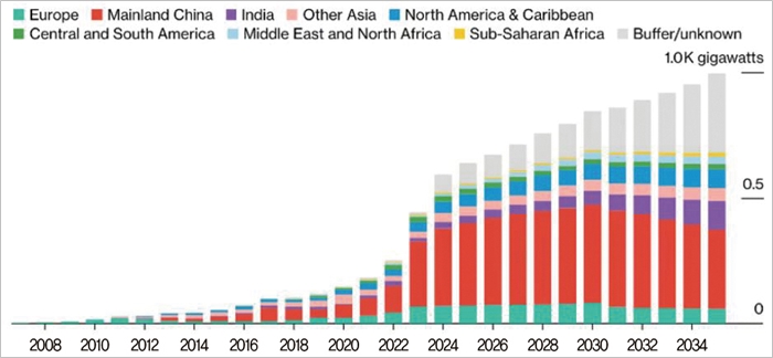 태양광 모듈 신규설치용량은 매년 꾸준히 증가해 2035년까지 996GW에 도달할 것으로 예측됐다. 공급과잉에 대처하는 모듈 제조기업들이 재고자산 손실을 최소화하고자 가격 덤핑을 촉발하고 있기 때문에 제조업 생존경쟁은 더욱 치열해지고 있다.