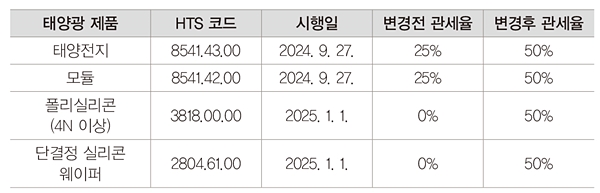 최종조치에서 중국산 태양전지에 대한 수입 관세를 종전 25%에서 50%로 인상하는 바이든 행정부의 5월 개정안을 유지해 9월 27일부터 시행한다. 더욱이 2025년 1월부터 폴리실리콘과 웨이퍼에 대한 관세율도 0에서 50%로 인상할 것을 제안하고 있다. 중국 의존도를 낮추고 공급망 다각화를 촉진하는 효과를 거둘 수 있다는 의도이다.
