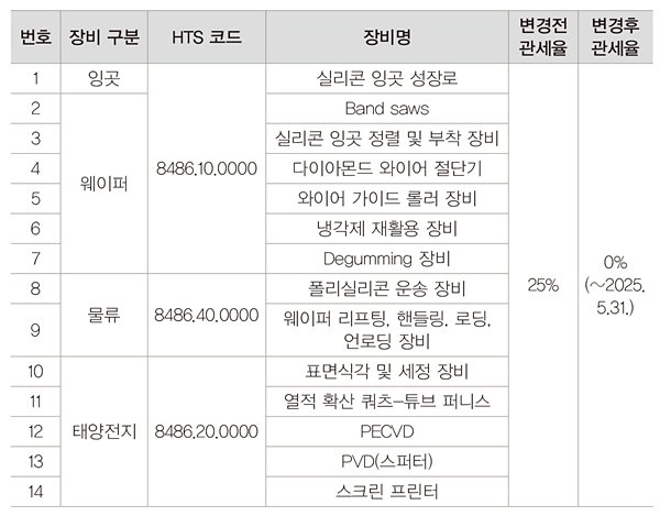 다만, 미국 태양광 제조업의 연착륙을 도모하기 위해 태양전지 제조장비 5종, 잉곳·웨이퍼 제조장비 7종, 물류 2종 등 14종의 제조장비에 대해서는 2025년 5월 말까지 관세를 임시 제외하는 것으로 결정됐다. 바이든 행정부의 5월 개정안에서 제안된 모듈 제조장비 5종은 중국외 국가에서 공급망 다각화가 가능하므로 관세 임시 제외 대상에서 철회됐다.