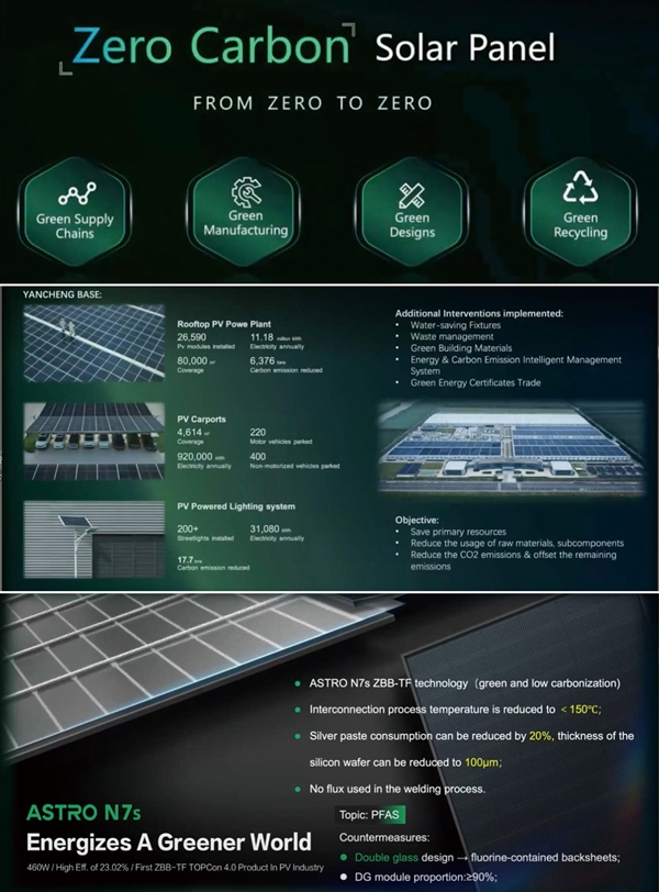 아스트로너지(Astronergy)는 2023년 7월 옌청(Yancheng)시에 세계 최초 탄소제로 태양광 모듈 공장을 구축해 TUV라인란드(TUV Rheinland)로부터 탄소제로 공장 인증을 획득했다고 주장했으며, 최근 주취안(Jiuquan)시에 구축한 공장도 TUV라인란드로부터 탄소제로 공장 인증을 획득했다고 발표했다. 아울러 2028년까지 탄소제로 공장을 8개로 확대 구축한다는 계획과 2035년까지 RE100을 달성하겠다는 목표도 발표했다.
